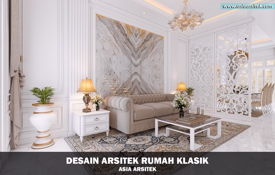 Ruang tamu dan ruang makan dihiasi panel dinding klasik, lampu gantung mewah, partisi ukiran putih, dan marmer sebagai aksen utama — menyatukan suasana nyaman dan berkelas.